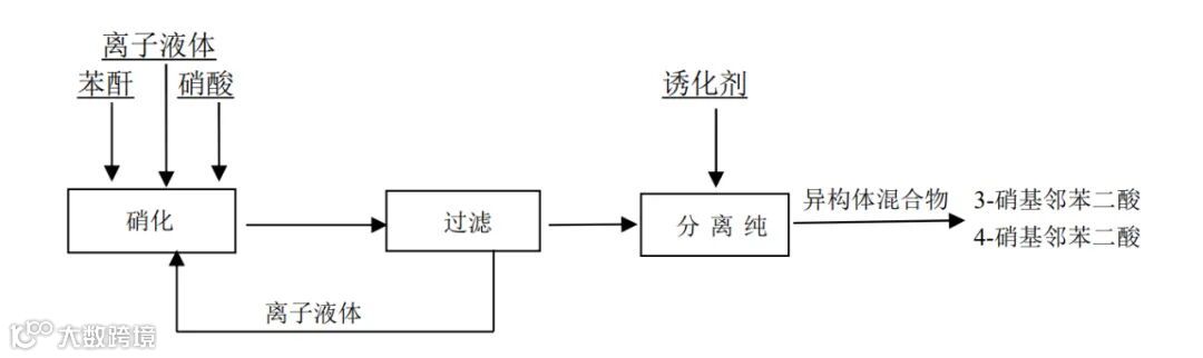 在新型离子液体中,用浓硝酸(或发烟硝酸)对苯酐进行硝化反应,苯酐的转化率≥98%,生成3-硝基邻苯二甲酸和4-硝基邻苯二甲酸异构体混合产物(生成率≥96%);