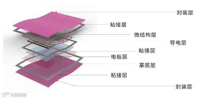 图1 :微结构柔性触觉传感器主要由微结构基底、导电涂层、采集电极、封装层组成