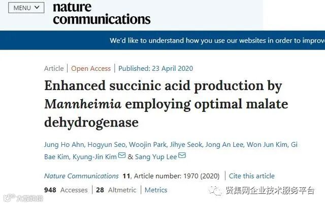 该项研究由韩国高等科学技术院(KAIST) 与庆北国立大学合作研发。相关研究成果以“Enhanced succinic acid production by Mannheimia employing optimal malate dehydrogenase”为题,发表在《Nature Communications》(自然通讯)上。