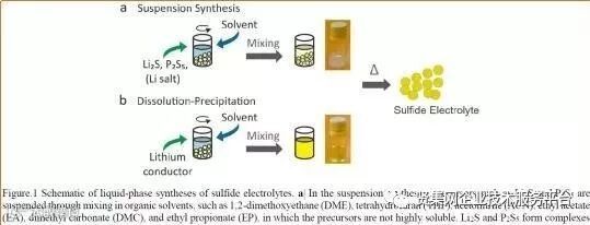 1)悬浮合成法:将Li2S和P2S5溶解于有机溶剂(DME、THF、ACN、EA、DMC及EP)中, 由于Li2S和P2S5在上述溶剂中溶解度较低,因此所得溶液为硫化物电解质的悬浮液,可通过进一步加热使溶剂蒸发,从而获得硫化物电解质。
