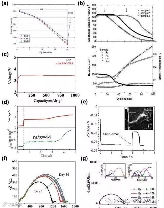 图1 固态聚合物锂电池的失效行为:(a)NCA/PEO/Li电池的循环性能;(b)上图为LiFePO4/聚合物电解质/Li电池的循环性能,下图为电池循环过程中的阻抗变化;(c)LiFePO4/PPC/Li电池在0.1C的过充曲线;(d)LiFePO4/PPC/Li电池在0.1C的充电曲线和m/z=44 (CO2)处对应的DEMS信号;(e)电压随时间的变化曲线,嵌入图为枝晶穿透聚合物电解质时的SEM照片;(f)Li/PVCA/Li的AC阻抗谱;(g)80 °C活化过程中Li/CPPC/Li对称电池的电化学阻抗变化。