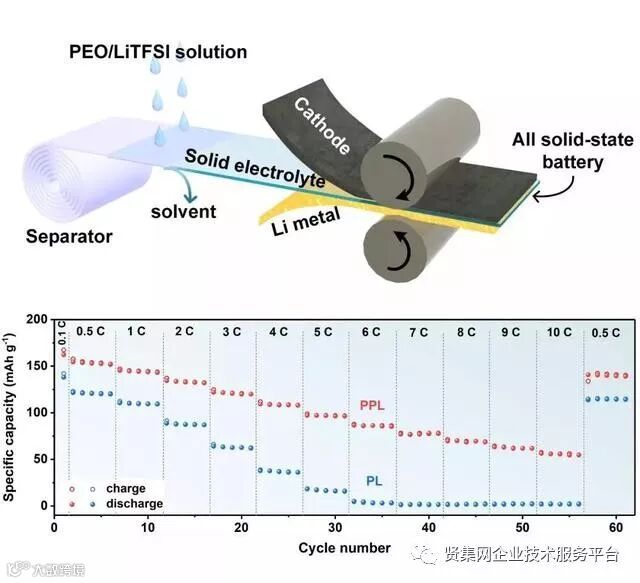 近期,华中科技大学李真教授和黄云辉教授研究团队报道了一种可规模化制备的超薄柔性聚合物电解质。他们利用简单的溶剂挥发法将聚环氧乙烷(PEO)/双三氟甲烷磺酰亚胺锂(LiTFSI)聚合物电解质填充至聚乙烯隔膜的孔道内,制备了厚度仅为7.5μm的超薄复合聚合物电解质。