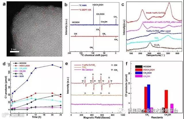 50 ºC反应20小时,C1含氧化合物最高收率达57.9 mol/molCr,总选择性93%。以13CH4为反应气体,通过13C-NMR、13C DEPT-135、2D 1H-13C HMQC等手段证实了C1含氧化合物的产物种类。