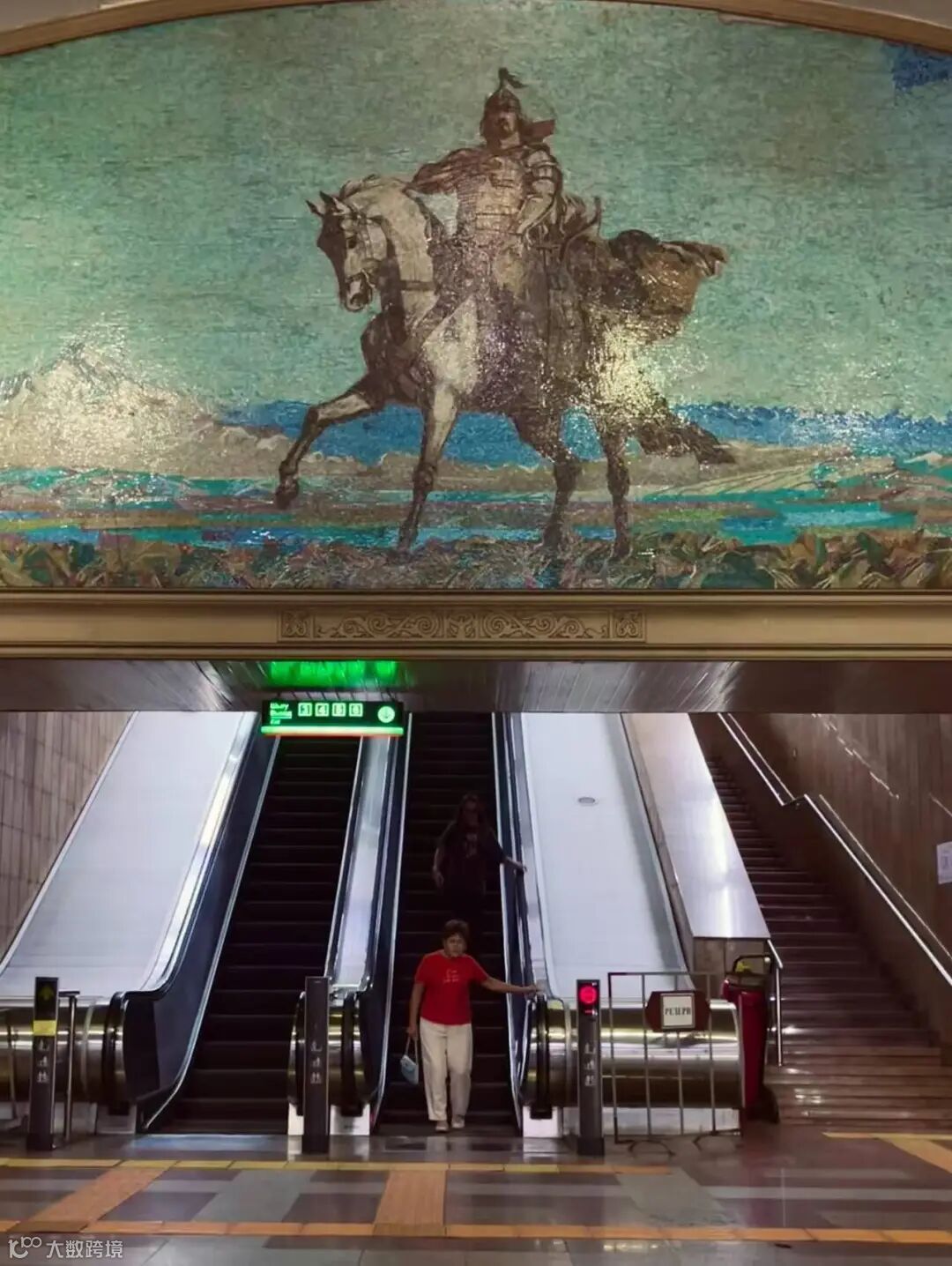 1️ Raiymbek Batyr(Райымбек батыра)- 拉伊姆别克巴特雷站,以哈萨克民族英雄命名,地铁内没有什么可观赏的,但站外可以看到一位民族英雄骑马,英姿飒爽的壁画。出站:中央清真寺