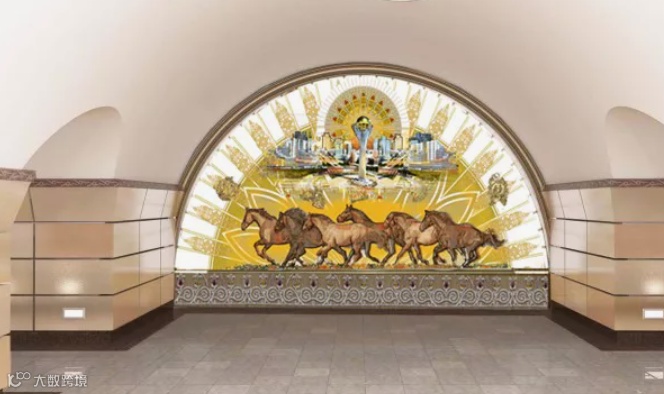 9 Moscow(Москва)- 莫斯科站,为纪念阿拉木图与莫斯科的友谊而命名,尽头无壁画,红色建筑风,出地铁后上楼梯有莫斯科相关的摄影展。尽头壁画:白马图,两侧有发光的花岗岩动物壁画。