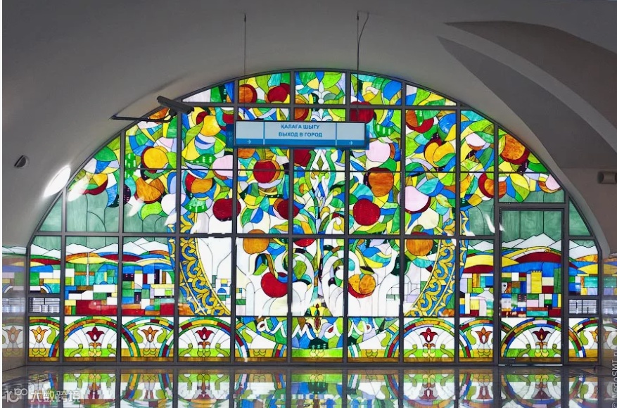 3️ Almaly(Алмалы)- 阿勒玛雷站,得名于城市“苹果之城”旧称,站内苹果树马赛克象征城市起源。出站:歌剧院和芭蕾舞剧院