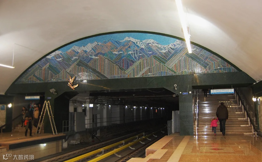 7️ Alatau(Алатау)- 阿拉套站,墙面模拟阿拉套山脉山体纹理,扶梯处展示四季山景壁画,意为“五彩的山”,指阿拉木图南面的外伊犁阿拉套山脉。