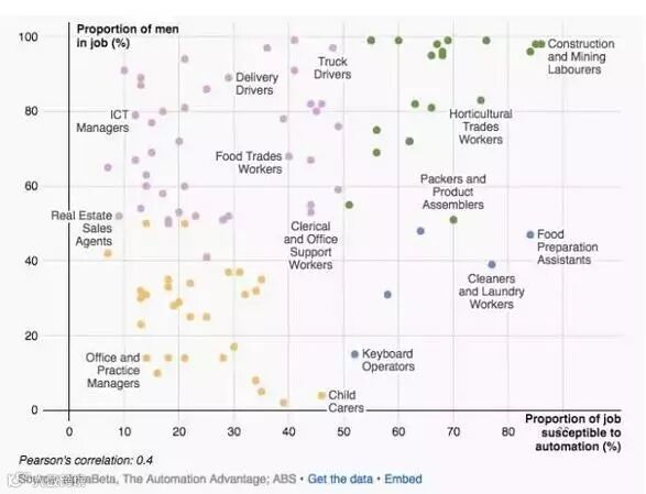 在上图中,更容易自动化的工种位于图的右侧,而男性工作比例较高的工作位于图的上方。