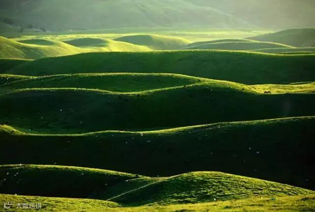印象中的草原,大多是“天苍苍,野茫茫,风吹草地见牛羊”的广阔无垠,一马平川,视野极为开阔。但特克斯的琼库什台草原,则充满了凹凸有致的曲线美。