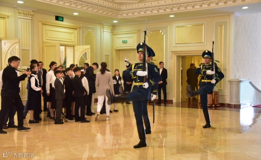 在导游的带领下,孩子们参观了总统官邸的中央礼仪大厅、接待厅、国家元首图书馆及官邸内的园林区域。讲解员详细介绍了阿克奥尔达建筑的历史沿革、建筑特色以及举办的重要国事活动等内容,激发了孩子们对国家机构和国家治理的浓厚兴趣。