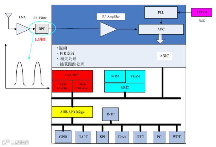 导航信号通过天线接收耦合经片外的低噪声放大器放大,实现低灵敏度接收;通过声表滤波器滤除带外干扰,再进入片内的射频放大器放大,其放大增益要确保ADC采样时可以实现噪声分层,ADC采样的信号进入ASIC电路进行数字下变频处理得到基带信号,进行捕获和跟踪处理得到导航电文,在CPU中进行位置解算,最后通过串口输出PVT信息。