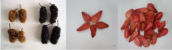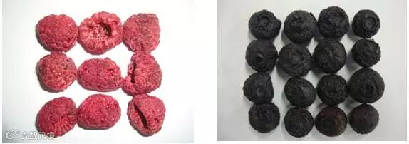 以蓝莓、树莓、桑葚、草莓、猕猴桃等浆果为原料,采用脉动压差闪蒸干燥、微波真空干燥、红外干燥、真空冷冻干燥、玻态干燥、太阳能干燥和热泵干燥等单一和联合干燥技术制备脆粒(片、条)、果脯果干等深加工休闲食品。产品富含花青素、膳食纤维、维生素、矿物元素、多糖或多酚等营养物质,同时具有绿色天然、色泽鲜艳、品质优良、食用方便和易于贮存等特点。