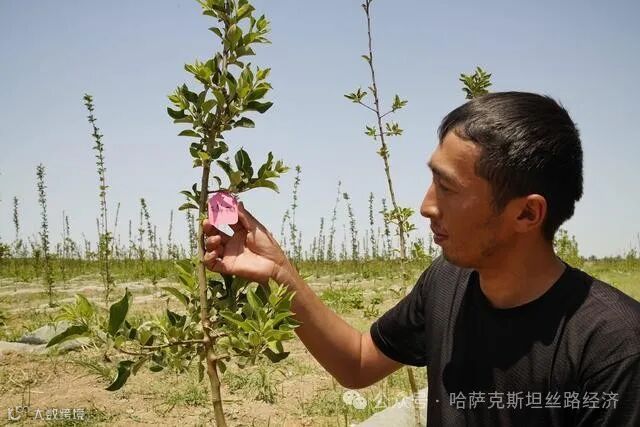 2024年7月28日,在乌兹别克斯坦锡尔河州,园区果农沙卡尔别科夫在检查青砧苹果种苗。新华社发(扎法尔 摄) 中乌现代农业科技示范园占地3500亩,目前已建设现代化设施农业大棚108亩、滴灌葡萄示范园1000亩、新品种试验示范园1260亩,除种植多种作物,还推广节水灌溉等种植技术。