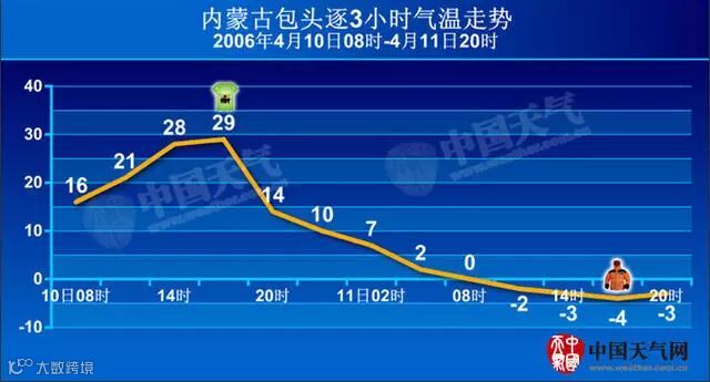 2006年4月10-11日,内蒙古包头24小时气温狂降33℃!这半日还是夏天呢,下半日已是冬天。数据帝为你再现一下当时奇葩的气温走势,4月10日还算符合常规,下午14点28℃、17点29℃,但是到了11日,气温走势一反常态,从凌晨2点到下午17点,气温一路狂降,白天17点达到了一天中的最低——零下4℃,比凌晨2点的7℃低了整整11℃!