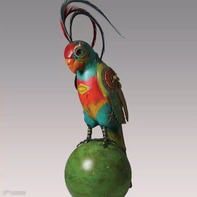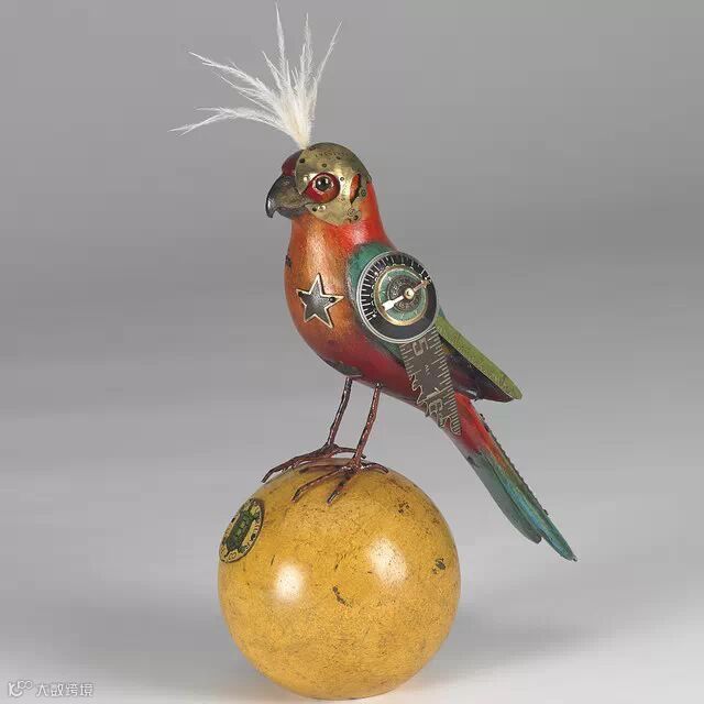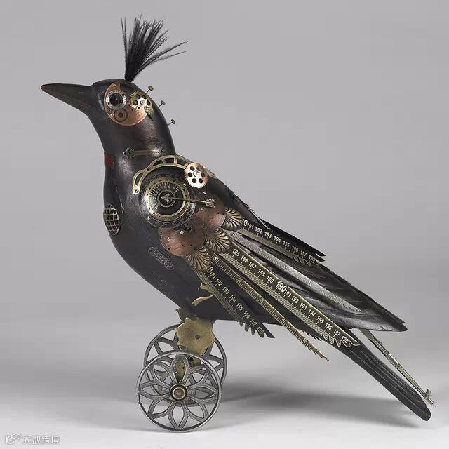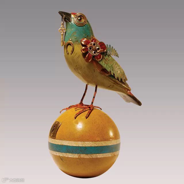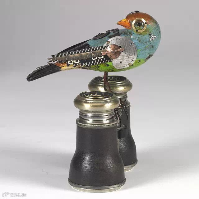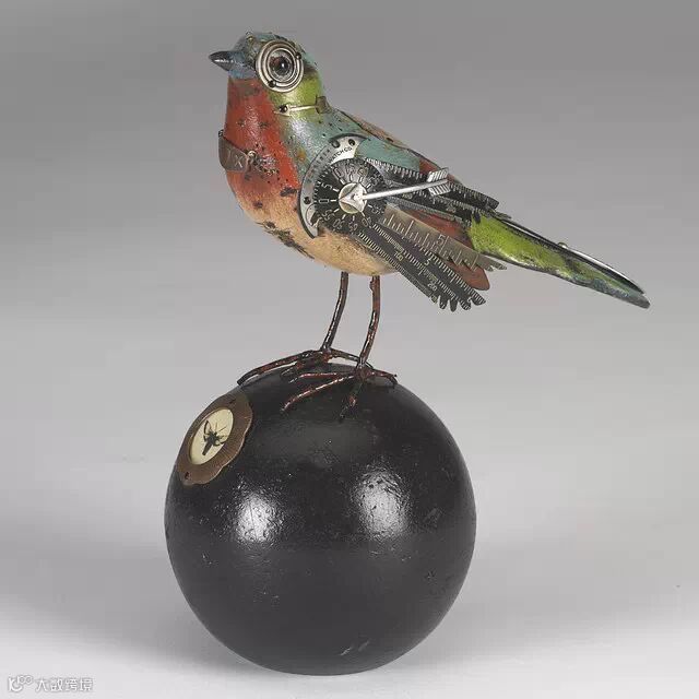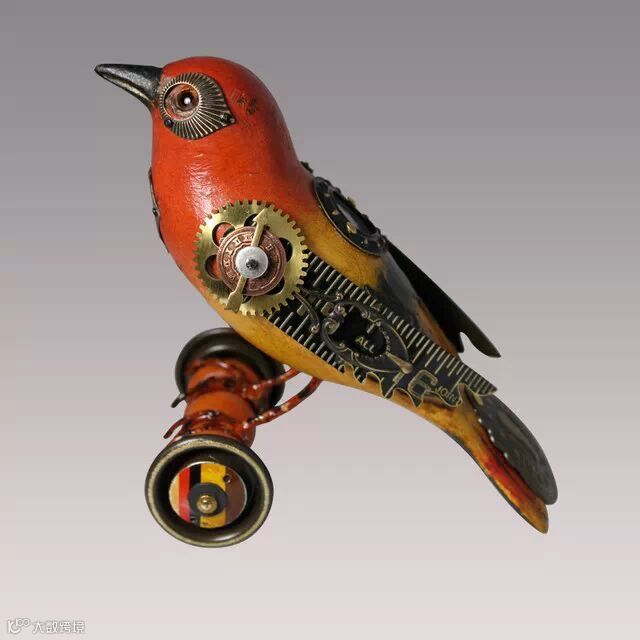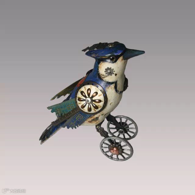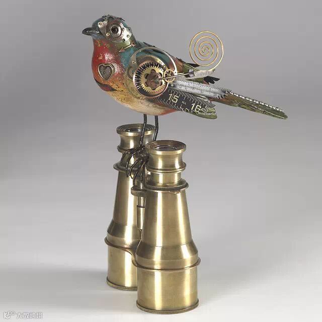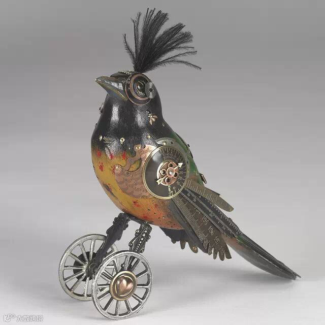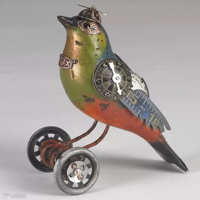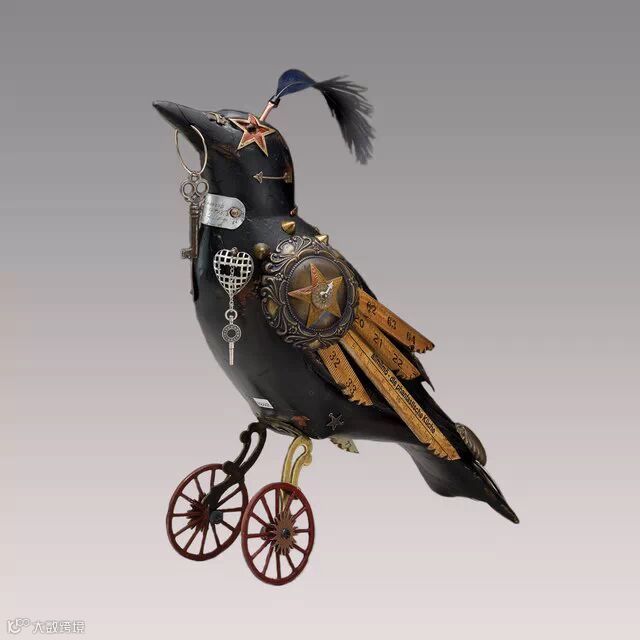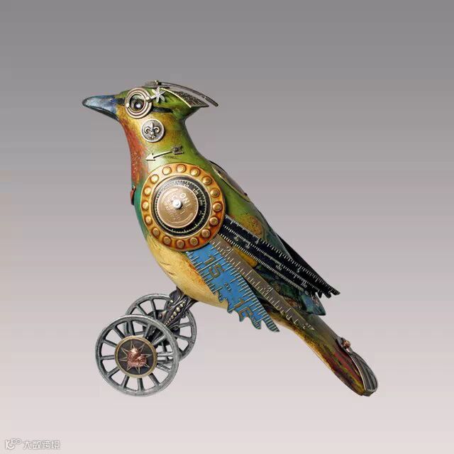 如果你要说上面Edouard Martinet的作品颜色太机械本色化,Mullanium工作室的作品就不会让你失望。Mullanium工作室由一对夫妇——Jim 和 Tori组成,他们痴迷于鸟类,大自然以及一些老旧物件,他们大量的收藏古旧的零部件,雕塑以及手表等,这些藏品几乎填满了他们位于佛罗里达庞帕诺比奇(Pompano Beach)的工作室。