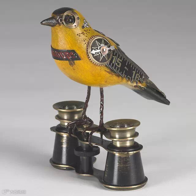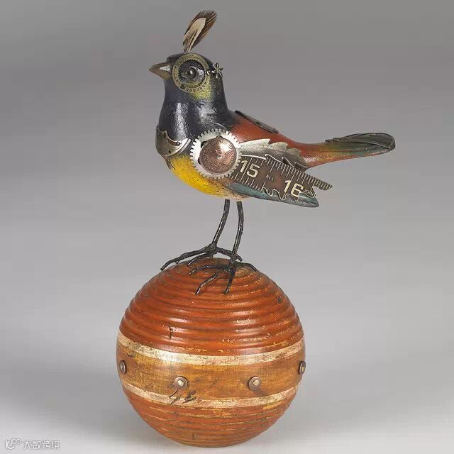 源于Jim对鸟类的热爱,他在一次制作首饰盒的过程中得到了灵感,于是创作了这个系列作品,每只鸟的雕塑都是纯手工完成,你会发现上面有许多旧物的零件,例如:手表表盘,尺子,齿轮等。它们被Jim 和 Tori组合到一起后显得非常精致而自然。