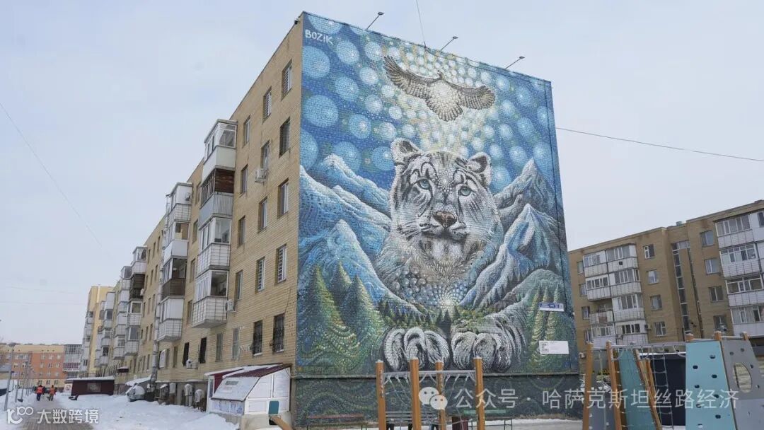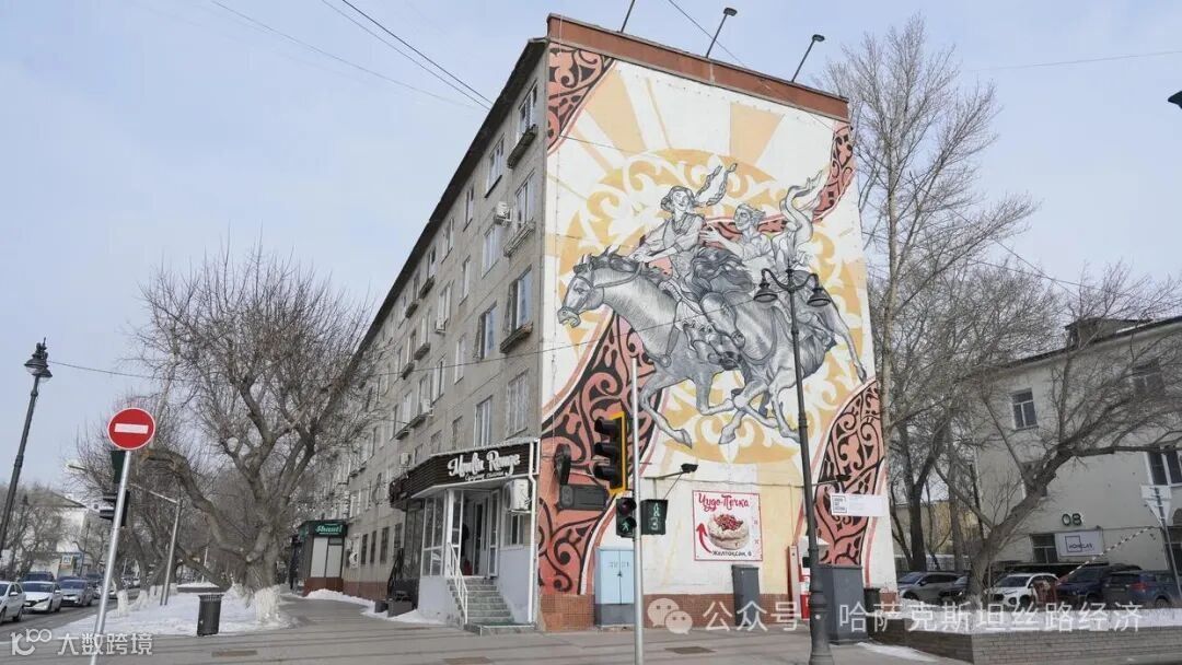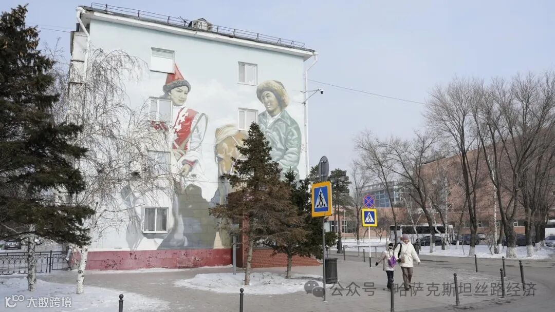 ↓这是2月19日在哈萨克斯坦首都阿斯塔纳市老城区拍摄的居民楼外立面的墙绘。