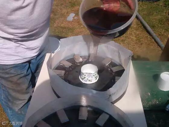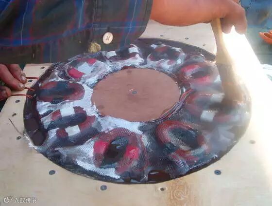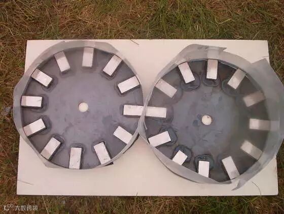 在安放磁铁时将N极和S极按照NSNS的顺序交叉排列,这样当转子旋转的时候线圈能更多地切割磁力线,从而将更多的机械能转化为电能。之后我们还做了一个外圈模具,,浇灌树脂并固化,用来将磁铁和圆盘固定为结实的整体。这里要注意的是磁铁的磁极表面离线圈越近,磁力线越密集,感应出的电压也越高,所以在浇灌树脂之前要将将磁铁露出的磁极表面整平。