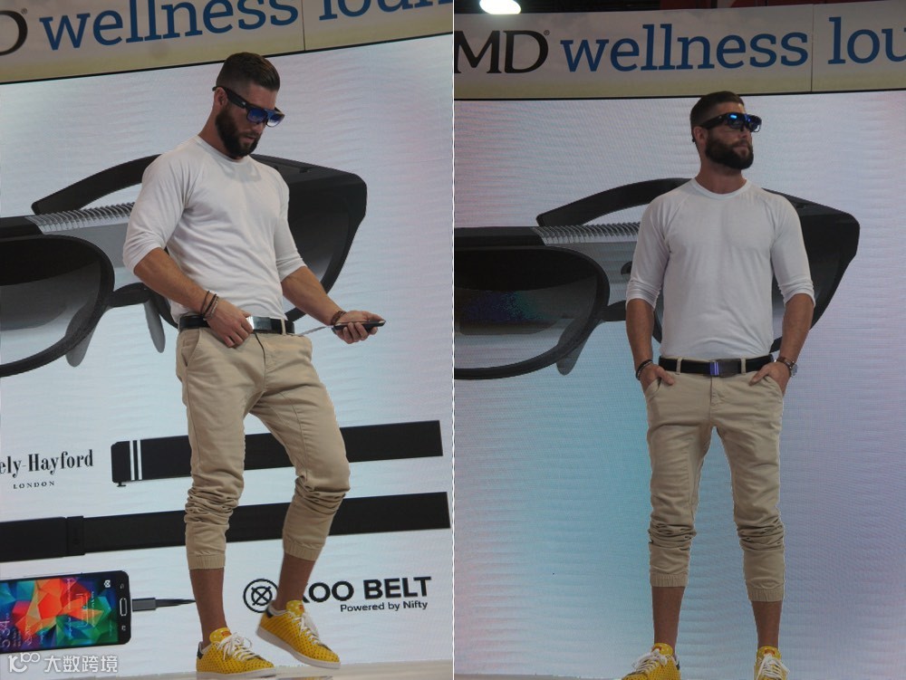 ▲这位模特并没有穿任何“智能”的服装,只是带了 ODG AR 智能眼镜,还有腰间帮着一根可以给手机充电的 XOO 皮带;