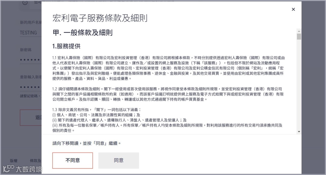 如下页面中填写用户名及密码后,点击[确认],阅读条款及细则后点击[同意]