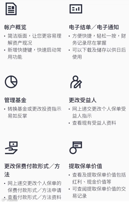 提示:保险公司会持续丰富和优化APP及系统服务功能,请以相关页面最新信息和服务功能为准,相关服务详情推荐登录官网www.manulife.com.hk查阅 。