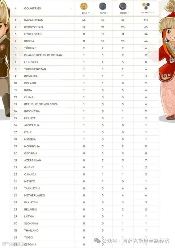 在本届运动会上,哈萨克斯坦代表团以44金、34银、37铜,总计115枚奖牌的总成绩,位列金牌榜榜首。