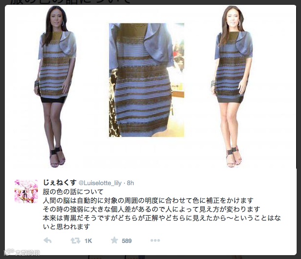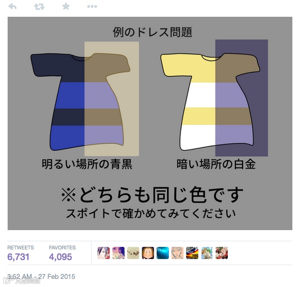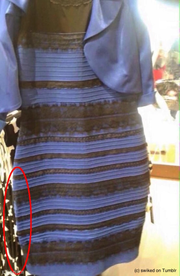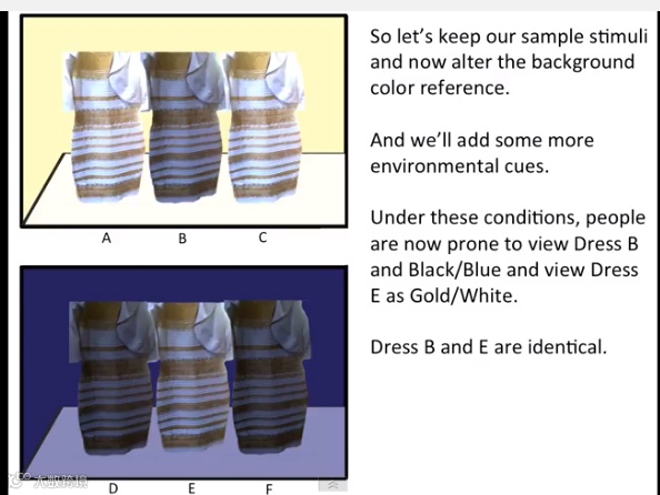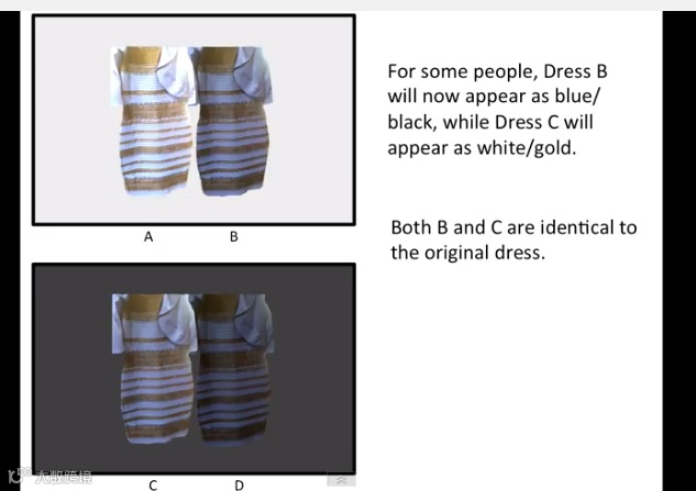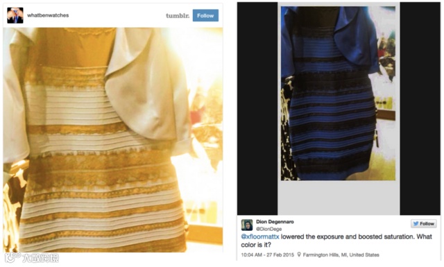 看见白金或蓝黑,两者没有谁对谁错可言。这个现象,是因为这件衣服在照片上所呈现出来的反射亮度,有可能是来自于两种状态。第一种:这是一件正常日 照下的蓝黑色衣服。第二种:这是一件因为背光而处于蓝黑色阴影中的白金衣。大脑在判断颜色时,选择了其中一种,所以有些人看到了蓝黑色衣服,有些人则看到了白金衣服。