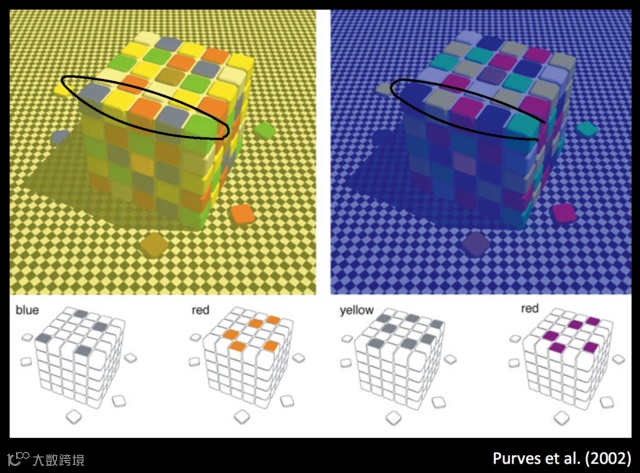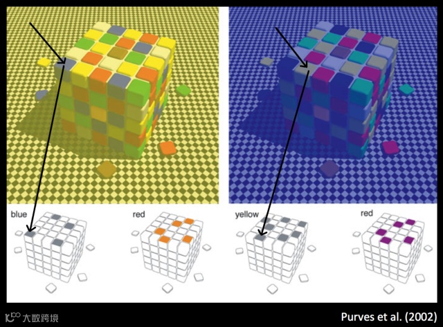 色彩恒常性,可以说是大脑中的自动白平衡机制。也就是说,只要给大脑足够的环境信息,例如背景光源、周遭其他物品的相对颜色,大脑就会自动调整白平衡,让你可以感觉到物体的原本颜色。再以上述暖黄色灯光下的蛋为例,如果你拿光学仪器去量测暖黄色灯光照射下的蛋,你会发现那颗蛋量起来的确是暖黄色的;但是当你用肉眼去观察时,虽然蛋看起来可能有些泛黄,但你仍会认为它是白色。——也就是说,不管光源如何变化,你的大脑会自动把光源和其他的物体相对颜色(例如图中的鲑鱼卵)纳入考虑,因此无论是上图中左或右的光源状态,大脑都会得出蛋仍然是白的结论。这就叫作色彩恒常性。