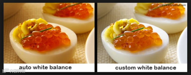 比如下图中的左图,当室内安装暖黄色灯炮时,那原本纯白色的蛋在暖黄色光线照射下,就会变成暖黄色。如果不先设置白平衡就直接拍照,那么蛋在照片中的物理光谱就会呈现暖黄色。反之,如果拍照时可以根据当时照明光线的暖黄色来调整色调,相机就会自动减去暖黄色,那么蛋在照片中的物理光谱就会恢复成纯白色。