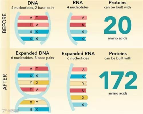 地球上所有的生命都采用4种DNA“字母”:A,T,G,C。就这四个,没有别的了!然而,今年,科学家在实验室里,将生命的基因密码扩展到了6个(加上了X和Y),在此组合下,氨基酸种类将由20种扩展到172种!
