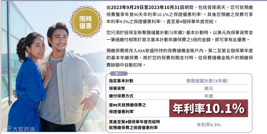 5.安盛:预缴享有90天年化10.1%利率。储蓄5年最高优惠28%,储蓄10年最高优惠31%。