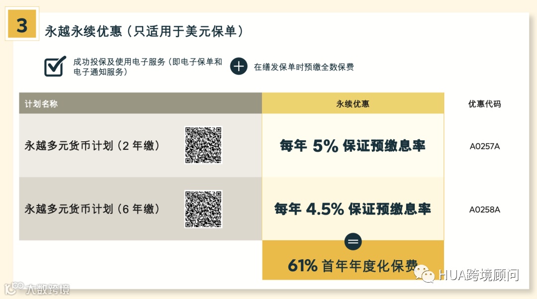 ②永续优惠:2年预缴5%保证利率,5年预缴4.5%保证利率