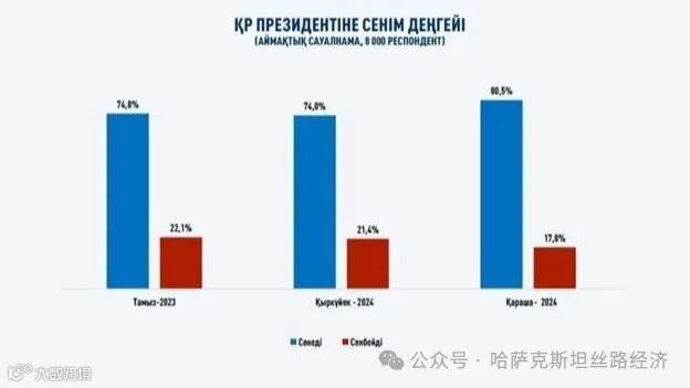 -总统的指出率达80.5%,保持较高水平。数据显示,青年人群的支持率为86.4%,而主体民族哈萨克族的支持率为82.2%。此外,女性和富裕群体的支持率也保持较高水平。公众的信心可能与政治改革、社会支持和经济措施的成果有关。-战略研究院分析人士古勒娜兹·哈斯莫娃说。