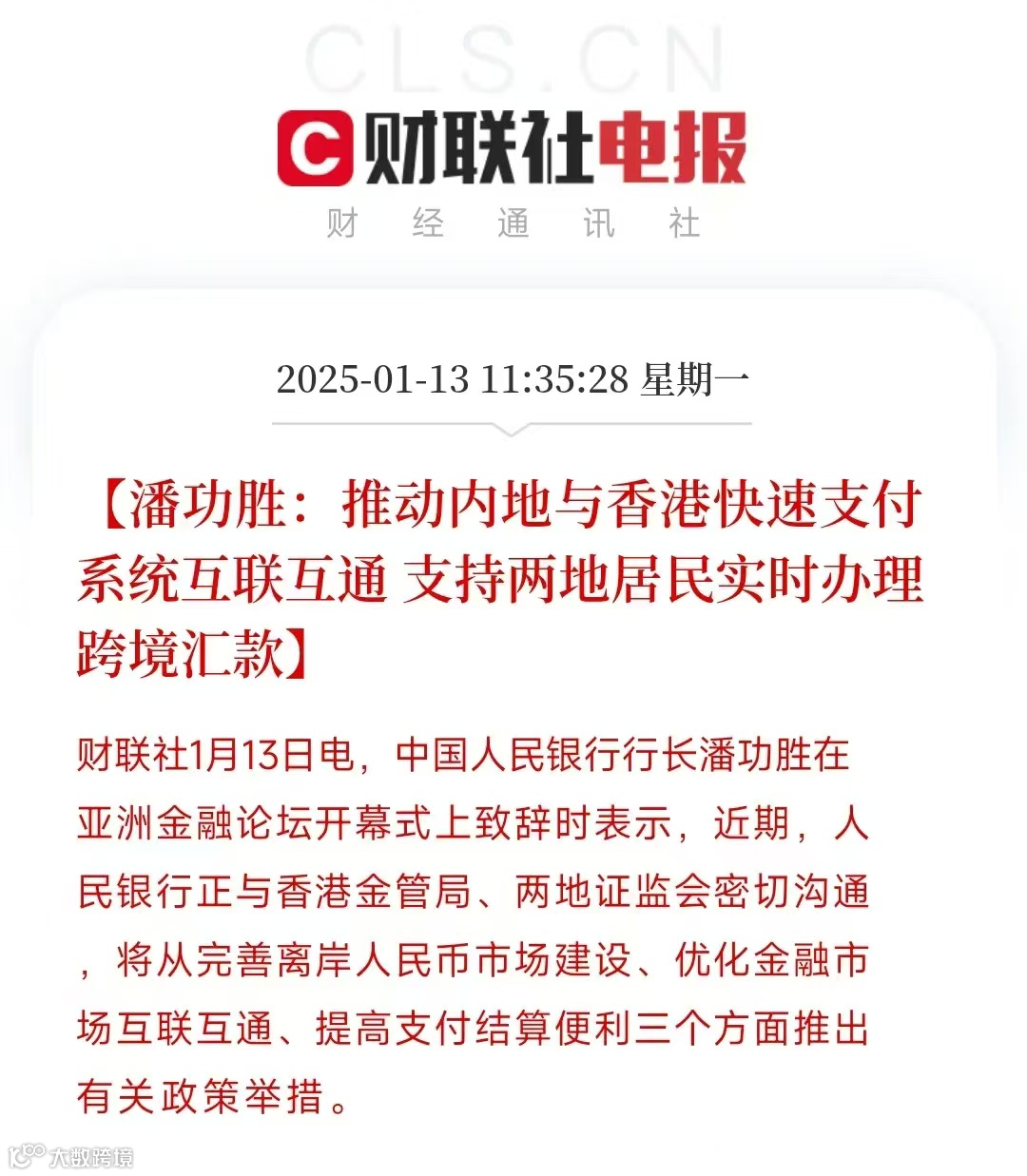 2025年1月13日,中国人民银行行长潘功胜在亚洲金融论坛开幕式上致辞时表示,加快推动内地与香港快速支付系统互联互通。
