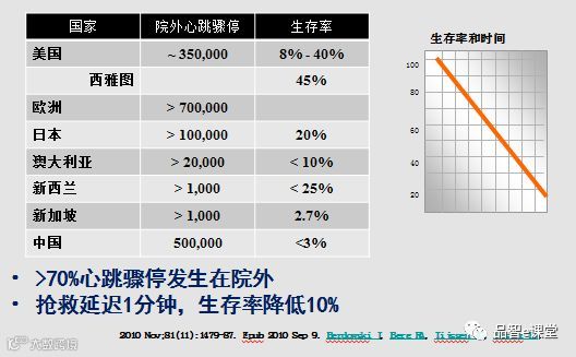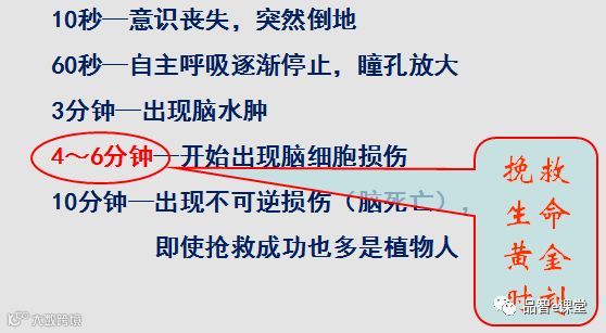 心肺复苏是现场急救过程中的重要操作,也是救命的关键。从下图中我们可以看到时间对于抢救生命的重要性。时间就是生命!