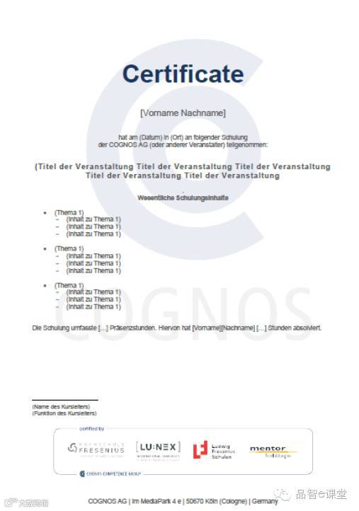 1.结业证书:完成康复高级管理精品课程可以获得德国费森尤斯应用技术大学办法的证书(具体见附件2)