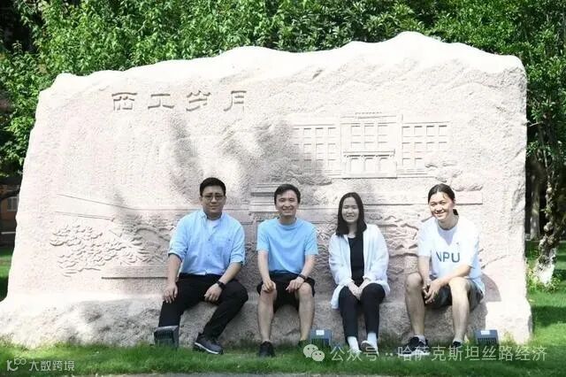 ↑6月26日,西工大哈萨克斯坦分校学生道托夫·铁木尔、博雷斯别克·穆拉特、伊萨耶娃·豪哈尔和图列加利·阿米尔(从左至右)在位于中国西安的西北工业大学本部校园内合影。