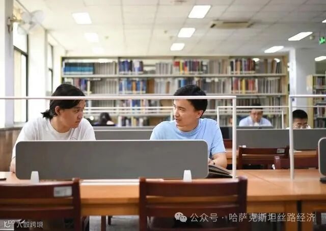 ↑6月26日,在位于中国西安的西北工业大学本部图书馆,西工大哈萨克斯坦分校学生博雷斯别克·穆拉特(右)和图列加利·阿米尔交流学习。