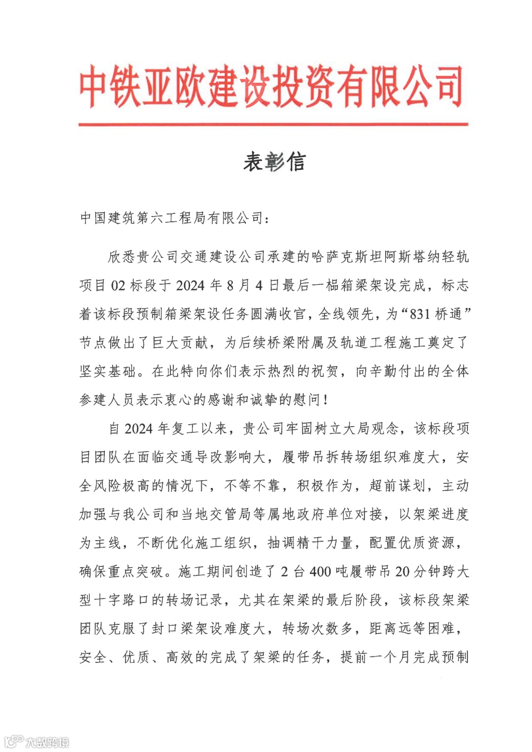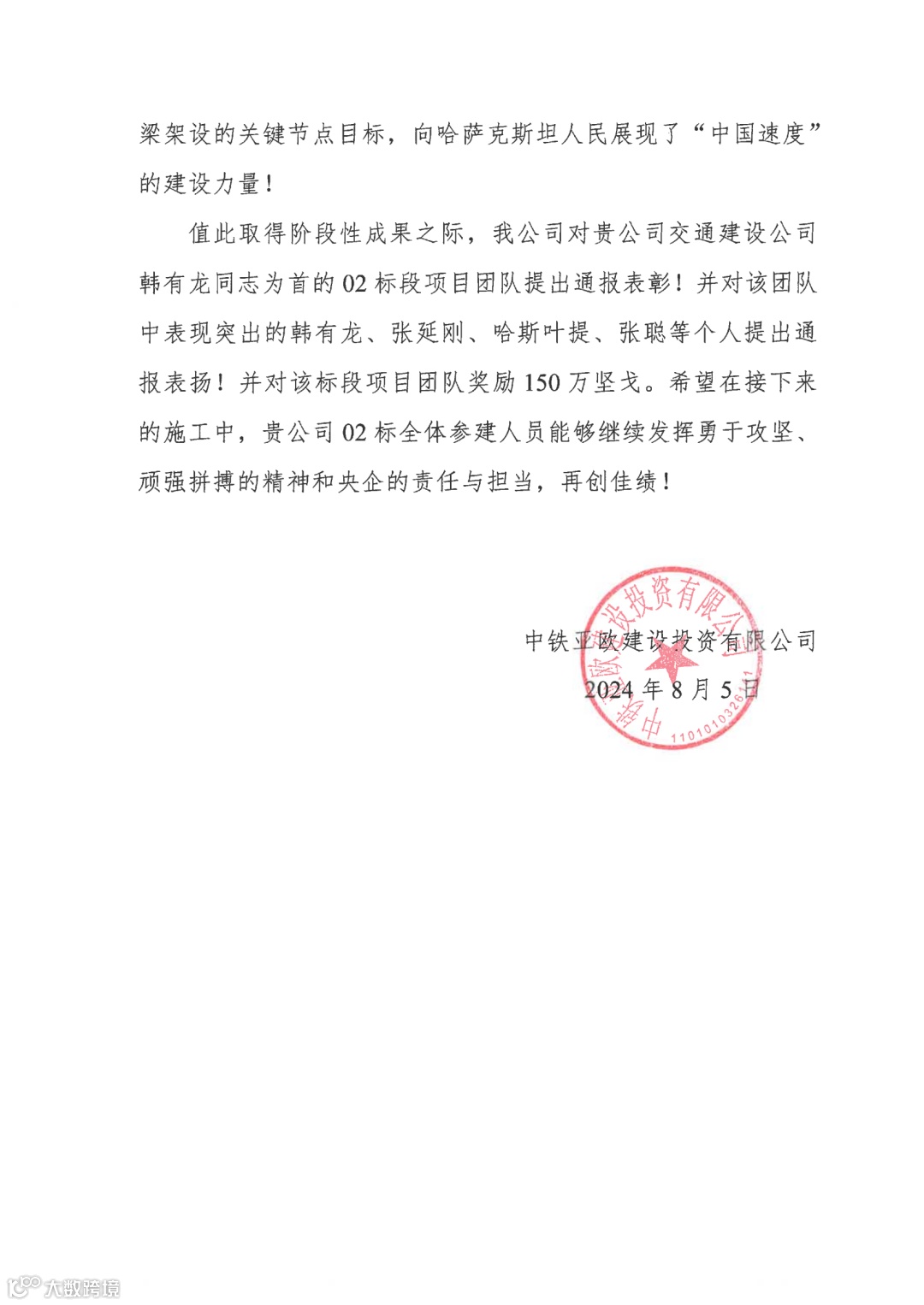 在中铁亚欧业主单位表彰信中写道,我司对贵公司交通建设公司韩有龙同志为首的2标项目团队提出通报表彰。并对该团队中表现突出的韩有龙、张延刚、哈斯叶提、张聪等个人提出通报表扬。希望在接下来的施工中,贵公司全体参建人员能够继续发挥勇于攻坚、顽强拼搏的精神和央企的责任与担当,再创佳绩。