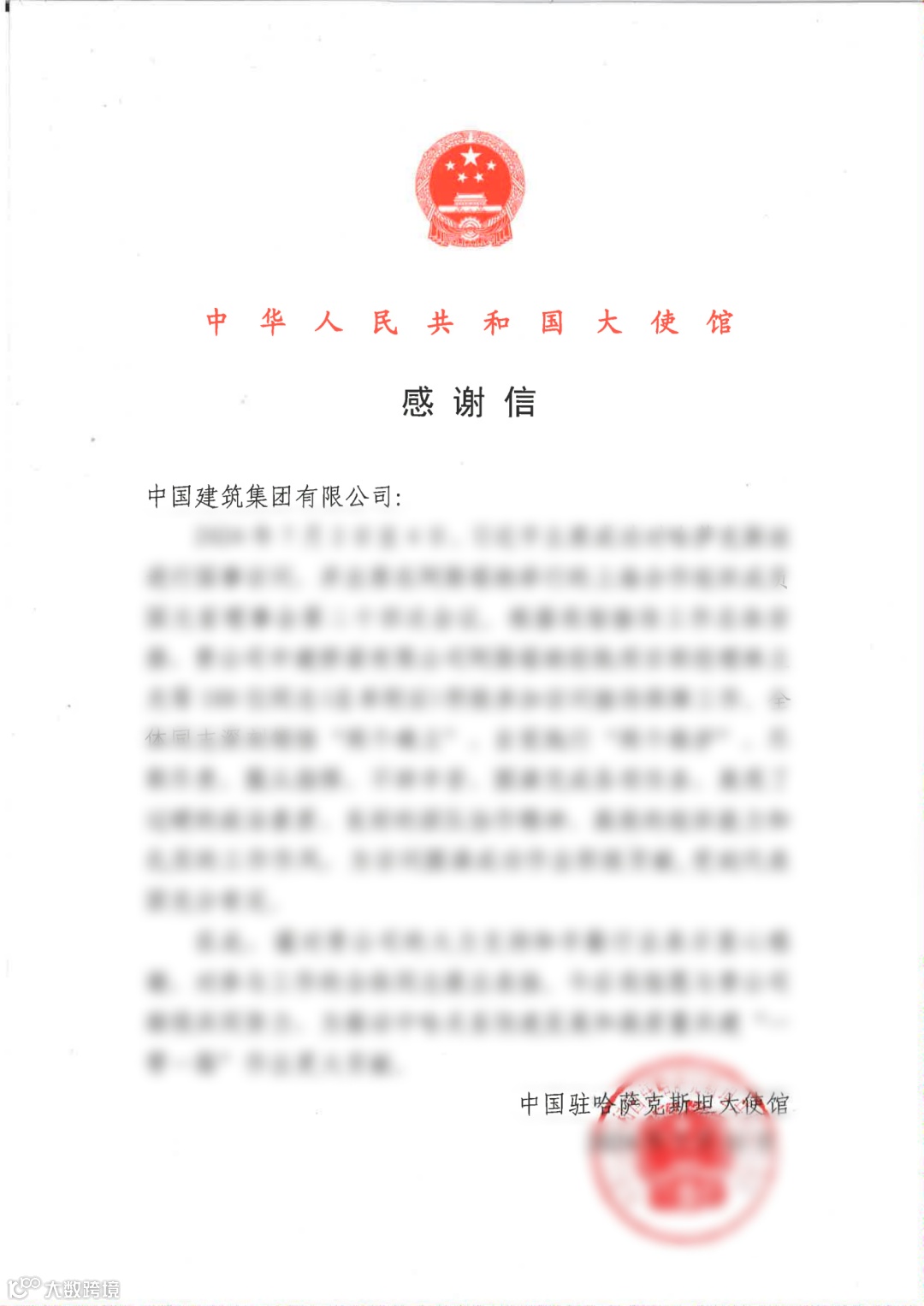 在中国驻哈萨克斯坦大使馆感谢信中写道,贵公司中建六局交通建设公司海外事业部总经理韩有龙等239位同志积极参加访问接待保障工作,为访问圆满成功作出积极贡献,受到代表团充分肯定。在此,谨对贵公司的大力支持和辛勤付出表示衷心感谢,对参与工作的全体同志提出表扬。今后我馆愿与贵公司继续共同努力,为推动中哈关系快速发展和高质量共建“一带一路”作出更大贡献。