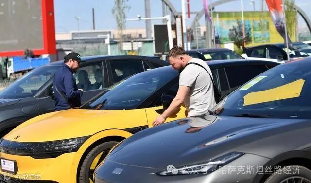4月19日,在中哈霍尔果斯国际边境合作中心,国外游客在了解展出的汽车。新华社记者 赵戈 摄