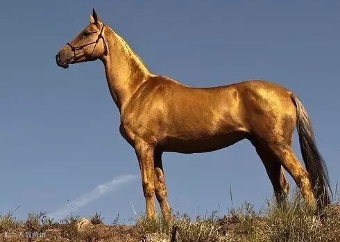 汗血宝马,原产地在土库曼斯坦科佩特山脉和卡拉库姆沙漠间的阿哈尔绿洲。是经过三千多年培育而成的世界上最古老的马种之一。