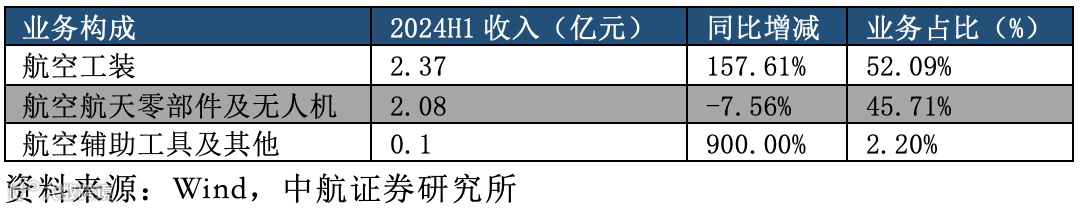 公司在航空工装方面承接了航空工业集团下属主机制造厂和科研院所众多型号军用飞机、民用飞机、通用飞机及无人机的航空工装研制。2024H1公司航空工装业务实现营业收入(2.37亿元,+157.61%),同比大幅提升,突破历史最高水平,公司在手订单稳步提升,业务占比达到52.09%,是公司目前营收规模最大的业务。