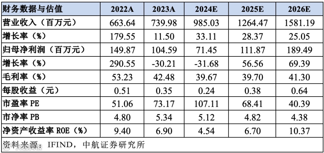 基于以上观点,我们预计公司2024-2026年的营业收入分别为9.85亿元、12.64亿元和15.81亿元,归母净利润分别为0.71亿元、1.12亿元及1.89亿元,EPS分别为0.24元、0.38元、0.64元(未考虑定增发行稀释的影响),我们维持买入评级,目标价36.00元,对应2024-2026年预测EPS的150倍、95倍、及56倍PE。