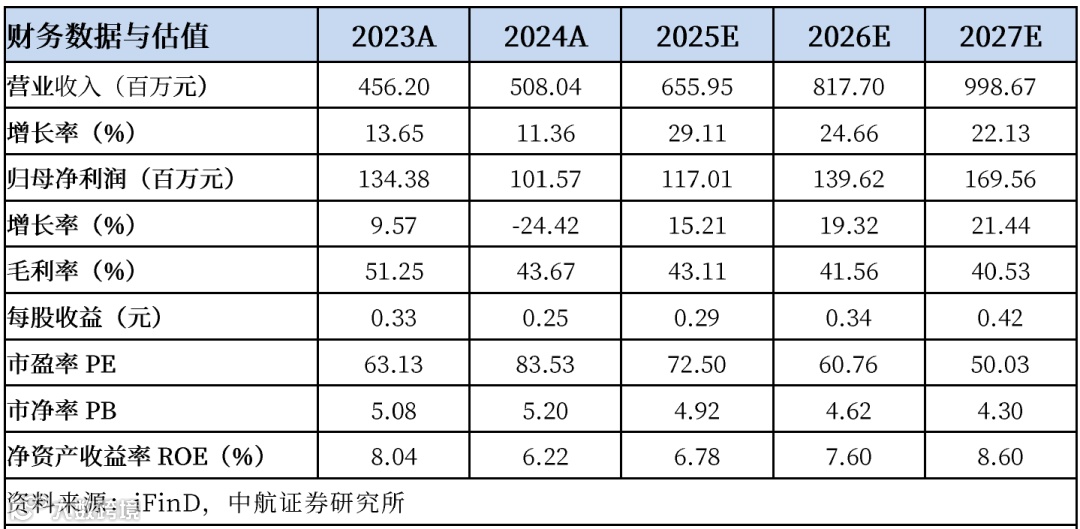 基于以上观点,我们预计公司2025-2027年的营业收入分别为6.56亿元/8.18亿元/9.99亿元,归母净利润分别为1.17亿元/1.40亿元/1.70亿元,EPS分别为0.29元/0.34元/0.42元,维持“买入”评级,给予目标价24.65元,分别对应85倍/73倍/59倍PE。