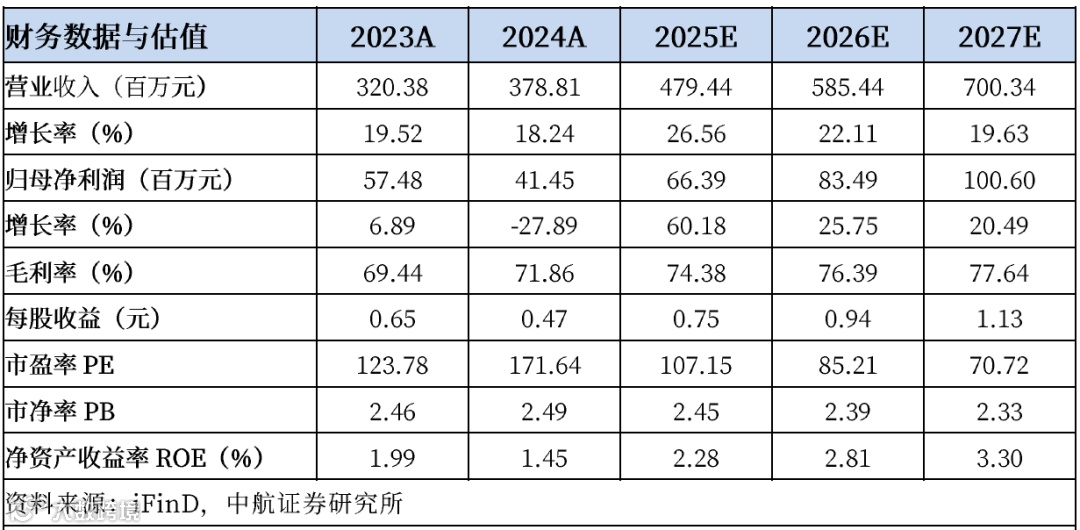 基于以上观点,我们预计公司2025-2027年的营业收入分别为4.79亿元/5.85亿元/7.00亿元,归母净利润分别为0.66亿元/0.83亿元/1.01亿元,EPS分别为0.75元/0.94元/1.13元,首次覆盖给以“买入”评级,给予目标价90元,分别对应120倍/96倍/80倍PE。