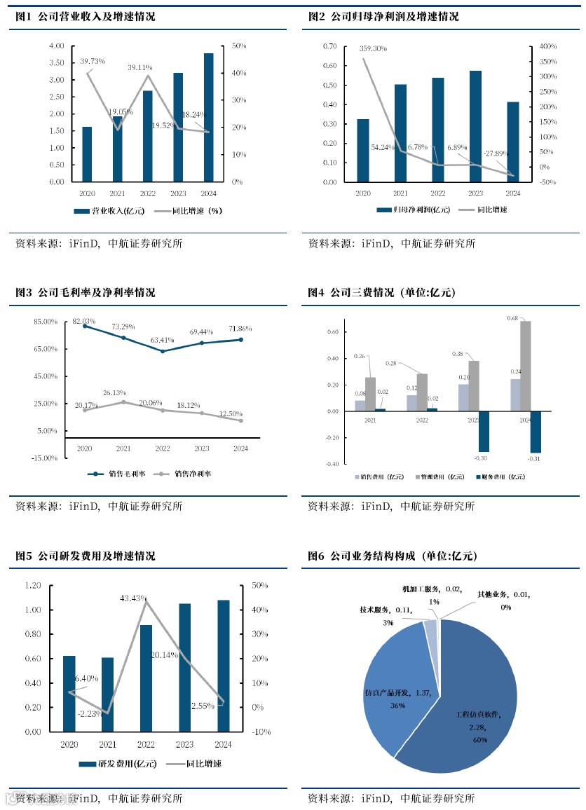 2024年,公司营业收入(3.79亿元,+18.24%),延续了2020年以来快速增长,毛利率(71.86%,+2.42pcts)稳中有升,主要系公司工程仿真软件销售业务收入(2.28亿元,+21.72%)大幅增长所致,且并购后技术服务业务毛利率(56.92%,+23.69pcts)显著提升所致。但受到公司管理费用率(17.95%,+6.10pcts)增长,同时应收账款坏账损失增加导致信用减值损失(0.63亿元)较2024年同期增长0.20亿元,公司归母净利润(0.41亿元,-27.89%)与扣非归母净利润(0.37亿元,-29.25%)均有所下滑。