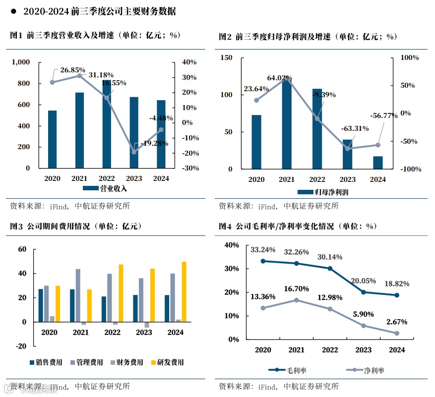 公司2024年前三季度营收(6.43亿元,-4.48%)略有下降,归母净利润(0.17亿元,-56.77%)与扣非归母净利润(0.15亿元,-51.17%)明显下降,毛利率(18.82%,-1.23pcts)略有下降,净利率(2.67%,-3.23pcts)下降明显,主要系期间费用率(17.72%,+3.20pcts)有所上升,政府补助减少导致其他收益(567.03万元,-40.01%)有所下降等原因所致。