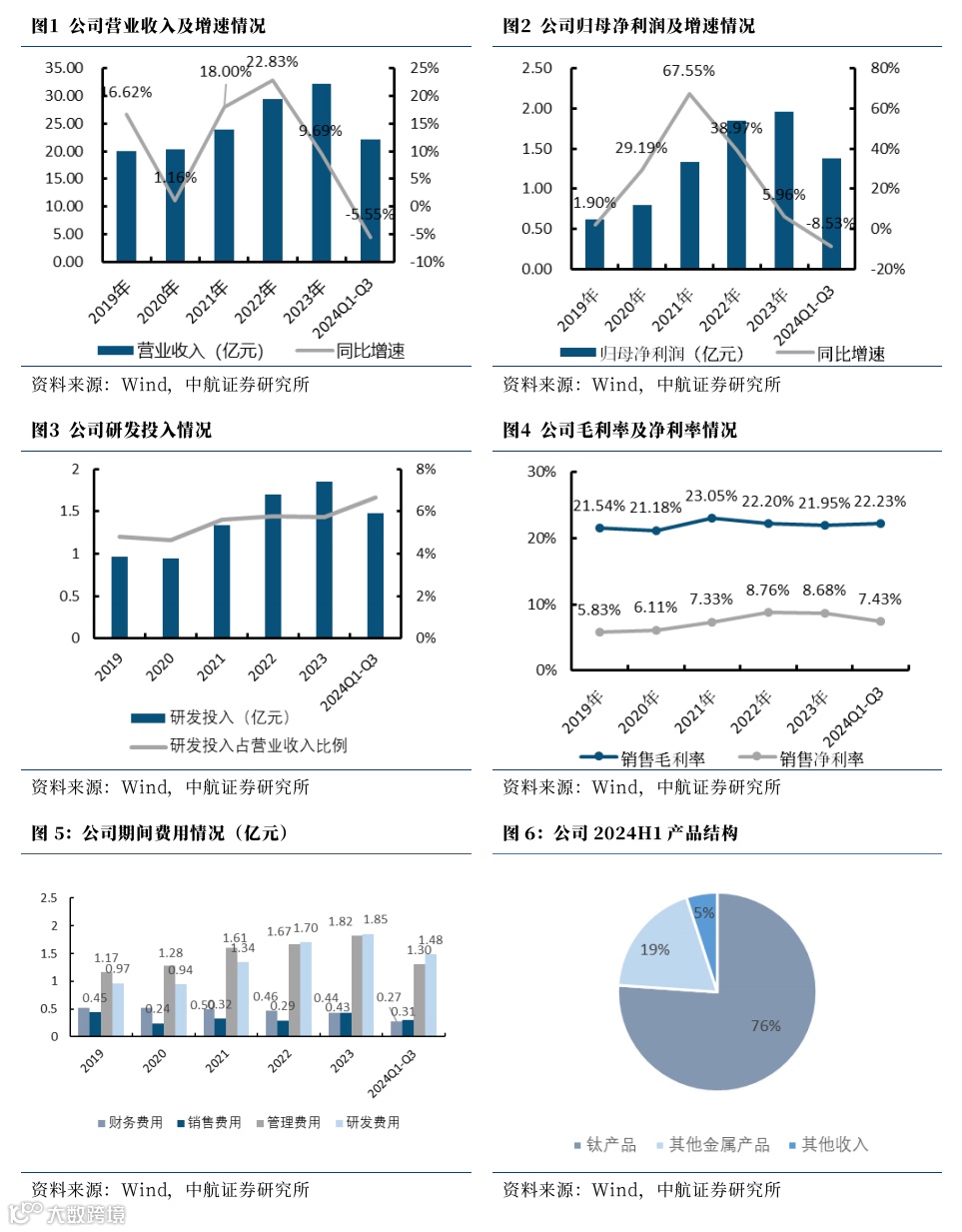 2024年前三季度,公司营收(22.20亿元,-5.55%)和归母净利润(1.38亿元,-8.53%)均有所下滑,但公司坚持围绕国家重点战略和高端民用材料需求方向,开拓新兴领域,优化产品结构,其中舰船、兵器、核电及新能源领域的需求持续增长。2024年上半年高端民用材料方面,高端钛合金产品收入同比增长8%,锆材收入同比增长43%,钽铌材料收入同比增长92%。