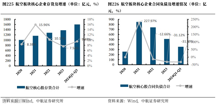 ②后续订单需求阶段性不足,存货规模较大:航空板块核心企业2024年前三季度合同负债规模达到(355.15亿元,-31.89%),同比大幅下降。合同负债规模一定程度上反映出企业的后续订单情况,可以看出,当前航空板块后续订单需求不足,短时间内不确定性较强。存货规模达到(1600.95亿元,+9.48%),存货规模达到近三年新高。可以看出,受到订单需求不确定性以及交付节奏影响,存货规模较大,部分企业出现存货积压情况,侧面反映出当前行业内面临生产与交付的平衡问题。
